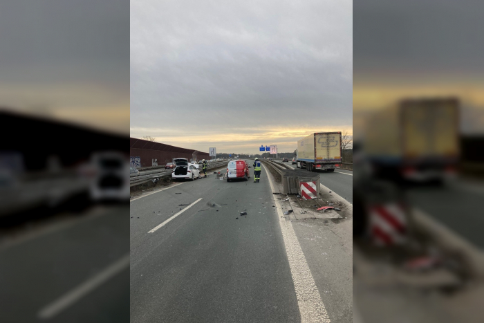 Ein 23-jähriger Fahrer aus Espelkamp war gegen 16:10 Uhr mit seinem Ford Transit auf dem rechten Fahrstreifen des Ostwestfalendamms in Richtung BAB 33 unterwegs. Beim Übergang zur BAB 33 wollte er trotz durchgezogener Linie nach rechts auf die baulich getrennte Fahrspur in Richtung der BAB 33 Richtung Osnabrück wechseln. Dabei kollidierte das Fahrzeug mit dem Anpralldämpfer und wurde auf die Fahrbahn zurückgeschleudert. Ein 20-jähriger Fahrer aus Warburg, der auf dem rechten Fahrstreifen mit seinem Skoda Octavia unterwegs war, konnte dem Transit nicht mehr ausweichen. Durch den Zusammenstoß schleuderte der Skoda nach links in die Mittelschutzplanke und kam dort zum Stillstand. Beide Fahrer erlitten leichte Verletzungen, die von Rettungskräften behandelt wurden.