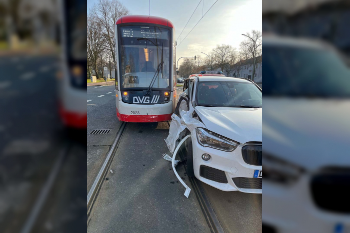 Am Montagmittag (19. Januar, 14:10 Uhr) kam es zu einer Kollision zwischen einem weißen BMW X1 und einer Straßenbahn an der Kreuzung Friedrich-Ebert-Straße Ecke Holtener Straße.