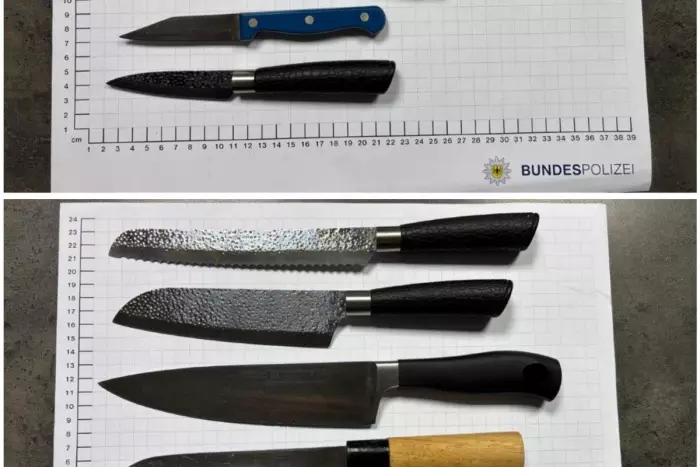 Nachdem er belehrt wurde, gab er an, als Koch zu arbeiten und sich auf dem Heimweg von der Arbeit zu befinden. Da er jedoch stark betrunken wirkte und den Konsum von Alkohol zugab, wurden die Messer beschlagnahmt. Er lehnte einen angebotenen Atemalkoholtest vor Ort ab.