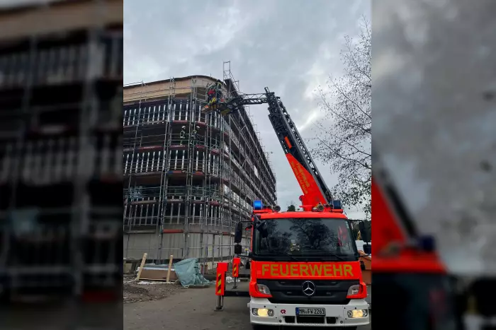 Ein Bauarbeiter verletzte sich schwer an der Wade auf einer Baustelle. Rettungsdienst und Feuerwehr brachten ihn sicher zu Boden und ins Krankenhaus.