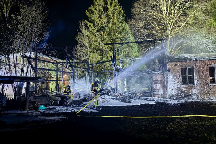 Mehrere Fahrzeuge brennen aus. In der Nacht zu Samstag geriet ein Holzunterstand in Brand, das Feuer griff auf Carports und Fahrzeuge über.
