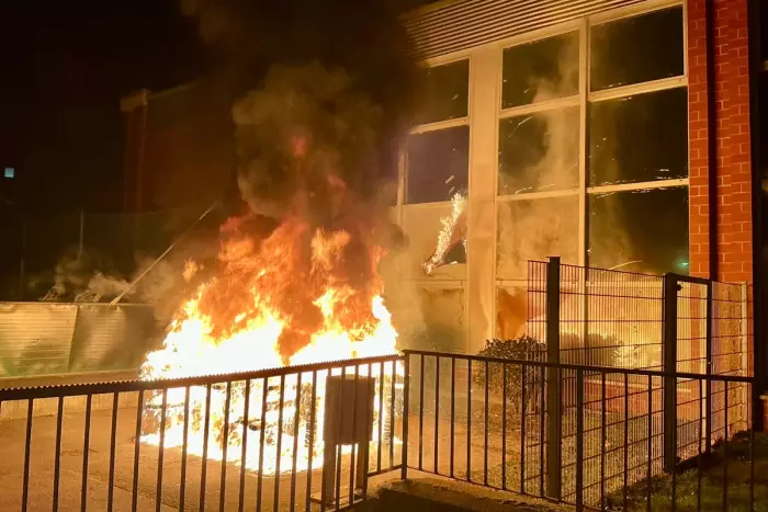 Feuerwehr verhindert Brandausbreitung. Die Flammen schlugen bereits gegen die Glasfassade des Gebäudes, aber ein Übergreifen auf die Sporthalle wurde in letzter Minute verhindert.