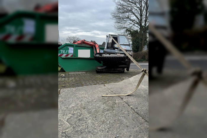 Noch am Freitagnachmittag gab es einen weiteren Einsatz: Ein Minibagger war auf der Straße „Auf der Helle“ gegen einen Container gerutscht und musste aus Sicherheitsgründen aufgerichtet und stabilisiert werden, um eine weitere Schadensausbreitung zu verhindern. Der Gerätewagen Logistik der Feuerwehr Herdecke mit Kran kam zum Einsatz, um das kontrollierte Aufrichten des Baggers zu ermöglichen. Etwa ausgetretene Betriebsmittel wurden vorsorglich abgestreut, bevor die Einsatzstelle übergeben wurde.