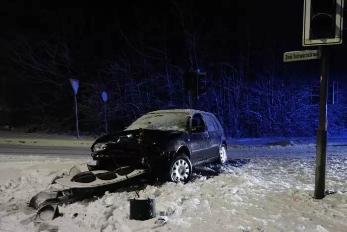 Um 2:15 Uhr fuhr eine 27-jährige Frau aus Ratingen mit ihrem VW auf der Mülheimer Straße in Richtung Breitscheid. An der Kreuzung Zum Schwarzebruch wollte sie nach rechts in Richtung Ratingen-Hösel abbiegen, geriet jedoch aufgrund der verschneiten Straße ins Schleudern und prallte gegen eine Ampelanlage auf einer Verkehrsinsel. Die 27-jährige Deutsche blieb zum Glück unverletzt, aber sowohl an ihrem Auto als auch an der Ampelanlage entstand laut vorläufiger Schätzung ein Sachschaden von 18.000 Euro. Der VW war nicht mehr fahrtüchtig und musste abgeschleppt werden.