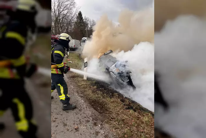 Feuerwehr löscht brennendes Auto nach Unfall, Verletzte Person ins Klinikum transportiert.