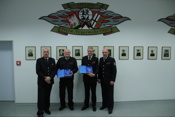 Zum Abschluss warf ein weiteres besonderes Ereignis bereits seine Schatten voraus. Der stellvertretende Leiter der Feuerwehr Olpe, Dirk Meiworm, legt sein Amt zum 31.01.2026 nieder. Christian Hengstebeck würdigte und bedankte sich für seine langjährige herausragende Arbeit. Florian Schröder und Matthias Springmann treten am 1.02.2026 seine Nachfolge als stellvertretende Leiter der Feuerwehr an.