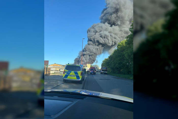 Feuerwehr bekämpft Brand mit sichtbarer Rauchentwicklung im Industriegebiet-Ost. Stadtalarm ausgelöst, NINA-Warnung vor Rauchgasen in umliegenden Städten.