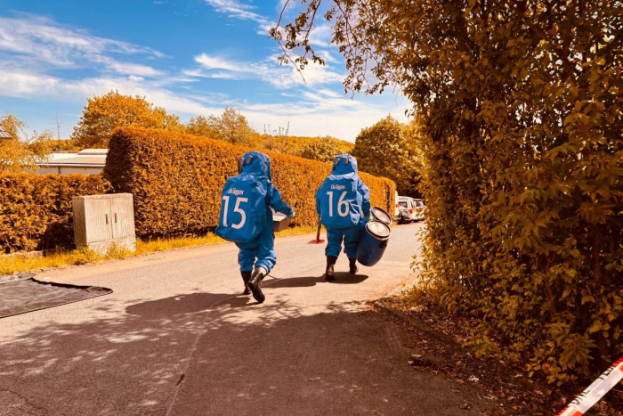 Die Feuerwehr führte weitere Untersuchungen unter besonderen Schutzmaßnahmen durch. Einsatzkräfte in Schutzanzügen kamen zum Einsatz, um den ausgetretenen Stoff zu sichern und in geeignete Behälter umzufüllen.