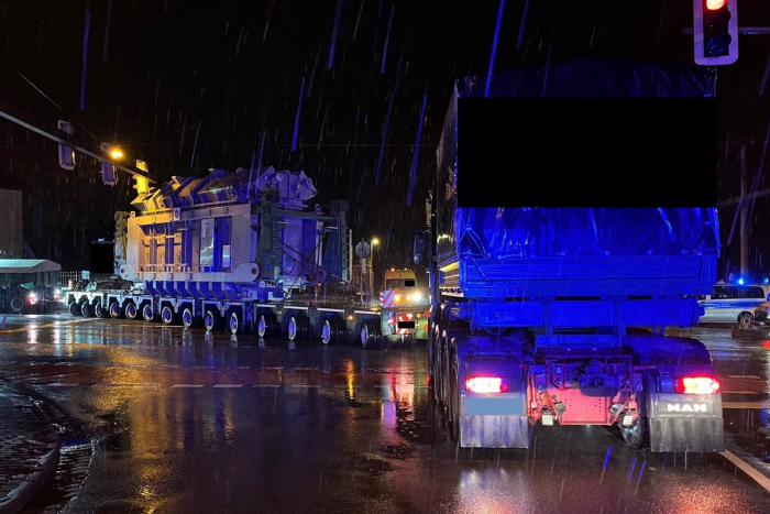 Ein Stromtransformator mit 185 Tonnen Eigengewicht wurde unter Polizeibegleitung erfolgreich transportiert. Trotz Herausforderungen wie Schneeregen und Ampelmasten kam der Transport planmäßig am Ziel an.