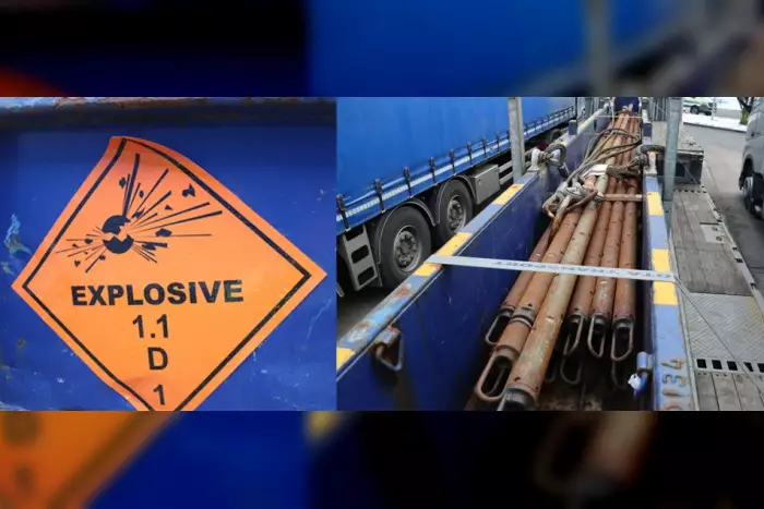 Ein 45-jähriger Fahrer transportierte eine offene und zugelassene Stahlkiste, die mit explosionsfähigem Material beladen war. Während der Kontrolle stellten die Polizisten verschiedene Mängel bei der Sicherung der Ladung fest. Außerdem war das Fahrzeug in einem nicht verkehrssicheren Zustand. Die Reifen, die Bremsanlage, die Windschutzscheibe und die Beleuchtung wiesen erhebliche Mängel auf.