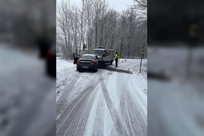 Zwei Personen leicht verletzt bei Kollision zwischen Pkw und Sprinter auf winterglatter Straße. Polizei warnt vor fehlenden Winterreifen.