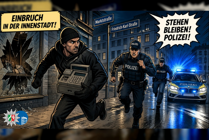 Am Freitagmorgen (24.04.) ereignete sich an der Ecke Marktstraße/Friedrich-Karl-Straße ein Einbruch in ein Geschäft. Der Verdächtige wurde sofort auf seiner Flucht zu Fuß festgenommen.