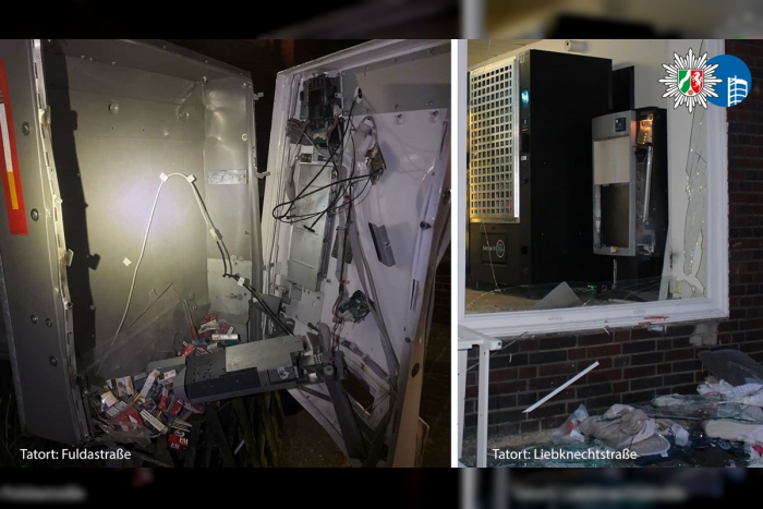 In der Nacht vom Sonntag auf Montag (27.04.) ereigneten sich zwischen 03:00 Uhr und 05:00 Uhr drei Explosionen an verschiedenen Orten im Stadtgebiet von Oberhausen. Bei allen Vorfällen wurden Zigarettenautomaten gesprengt und danach geplündert.