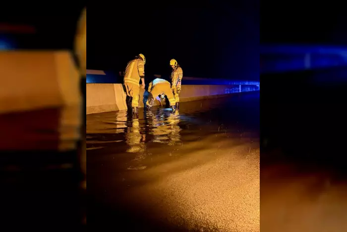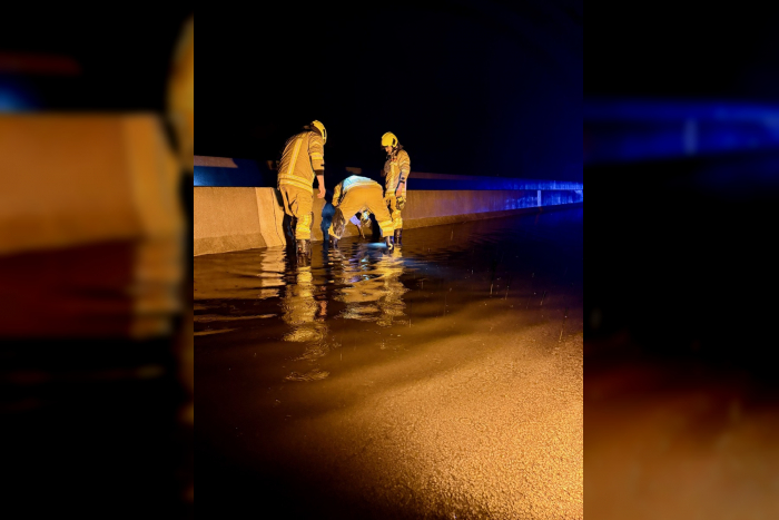 Feuerwehr Ratingen alarmiert wegen Unfall zwischen Autobahnkreuzen. Zwei PKW beteiligt, Wasseransammlung auf linken Fahrspur.