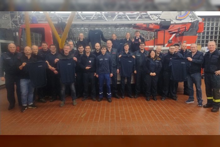 Besuch und Spende für die Feuerwehr Schermbeck. Neue Funktionsshirts und Wintermützen als Geschenk.
