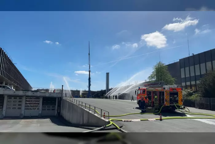 Am Sonntag trafen sich Jugendfeuerwehren zu einer Übung bei Diebold Nixdorf. Eine Explosion im Gebäude führte zu 10 Verletzten und Brandbekämpfung.
