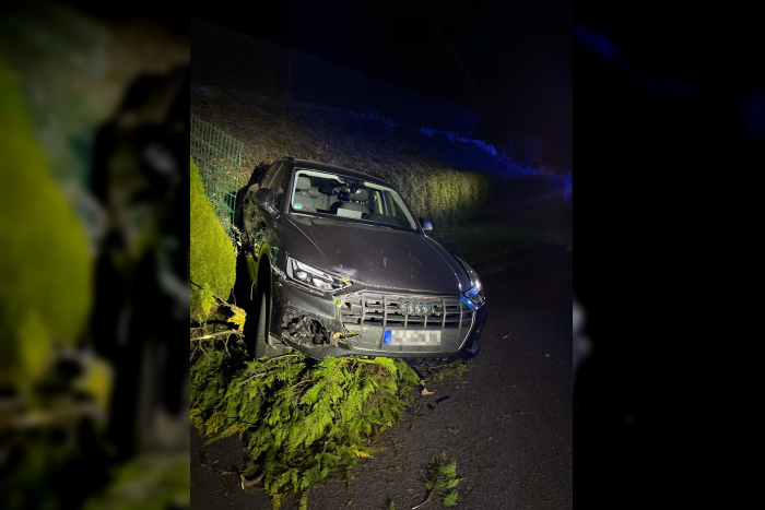 Durch die Hecke hindurch: Gestern Abend hat ein geparkter Audi sich selbstständig gemacht und kam erst nachdem er mehrere Gärten, Zäune und Hecken durchquert hatte, auf einem Lebensbaum zum Stehen.