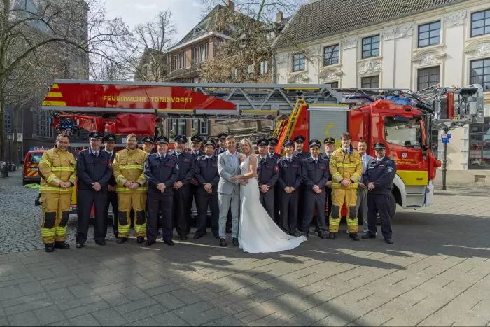 Ralf ist stellvertretender Löschzugführer und Führungskraft bei der Feuerwehr Tönisvorst im Löschzug St. Tönis. Darüber hinaus ist er einer der Gründungsmitglieder der Jugendfeuerwehr im Jahr 1994 und wurde letztendlich 1997 in den aktiven Dienst überstellt, wo er seither diverse Lehrgänge und Einsätze absolviert. Beruflich ist Ralf Sielaff als Schlosser in der Industrie tätig und bringt dort sein technisches Know-how ein. Kennengelernt haben sich Ralf und selbstständige Beraterin im Jahr 2019 und beschreiten seither den gemeinsamen Lebensweg. Auf einer Karnevalsparty fand durch einen Kameraden organisierte „Generalprobe der Eheschließung“ statt. Was an diesem Abend noch als Spaß anzusehen war, wurde von beiden akribisch geplant und letztendlich in die Tat umgesetzt. Auch eine Abordnung der Feuerwehr hat es sich nicht nehmen lassen, das Brautpaar zu beglückwünschen. Nach dem standesamtlichen „Ja“-Wort ging es für beide durch den Schlauchbogen hin zur Drehleiter. Nach einer Fahrt in luftige Höhen über die Dächer von St. Tönis, gab es noch ein gemeinsames Fotoshooting mit den Anwesenden.