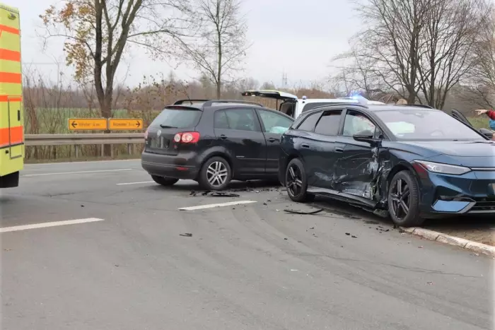 Am Donnerstag, dem 4. Dezember, fuhr ein 53-Jähriger mit einem VW ID7 von Holzminden kommend in Richtung Höxter auf der K46. Gegen 10.20 Uhr wollte er nach links in Richtung Lüchtringen abbiegen. Dabei kollidierte er mit einem entgegenkommenden VW Golf, der von einer 69-Jährigen gefahren wurde. Der VW ID7 wurde daraufhin auf eine Verkehrsinsel geschleudert.