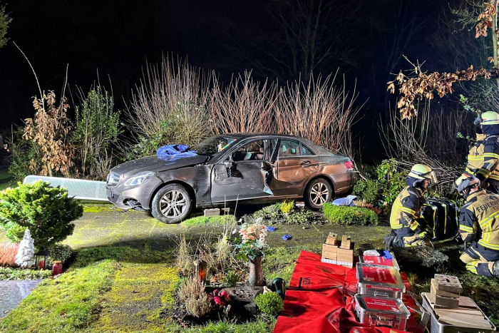 Ein Auto war aus bisher ungeklärten Gründen von der Straße abgekommen, hatte einen Zaun zum angrenzenden Friedhof durchbrochen und war auf dem Friedhofsgelände zum Stehen gekommen. Im Fahrzeug befanden sich zwei Personen.