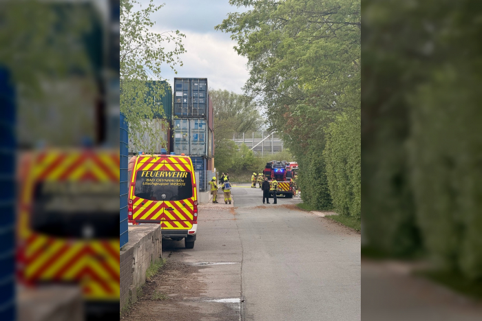 Am 19.04.2026 um 14:49 Uhr wurde die Feuerwehr Bad Oeynhausen zu einem Einsatz in die Dieselstraße gerufen, mit dem Alarmstichwort „Feuer Gefahrstoffe Industriebetrieb Stufe 1“. Bereits auf dem Weg dorthin konnten die Einsatzkräfte eine Rauchwolke über dem Gelände sehen. Zwei Trupps unter schwerem Atemschutz wurden eingesetzt, um das Feuer an der Außenwand einer Halle zu bekämpfen, das bereits fortgeschritten war. Gleichzeitig wurde die Halle von innen mit Hilfe einer Wärmebildkamera kontrolliert. Zur Nachlöschung wurde das Brandgut mit einem Gabelstapler auseinandergezogen und schließlich gelöscht.
