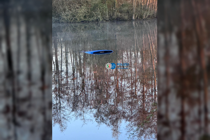 Polizisten wurden gegen 04.00 Uhr zu einem Teich am Meerbach gerufen – „Auto im Wasser“. Schon am Telefon stellte sich heraus, dass niemand verletzt war und auch niemand in Gefahr schwebte – nur eben ein Auto im Teich versunken war, von dem nur das Dach zu sehen war.