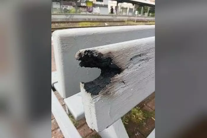 Eine brennende Sitzbank löst Feuerwehr- und Bundespolizeieinsatz aus. Unbekannte entzünden eine Bank, nur Teil der Rückenlehne beschädigt.