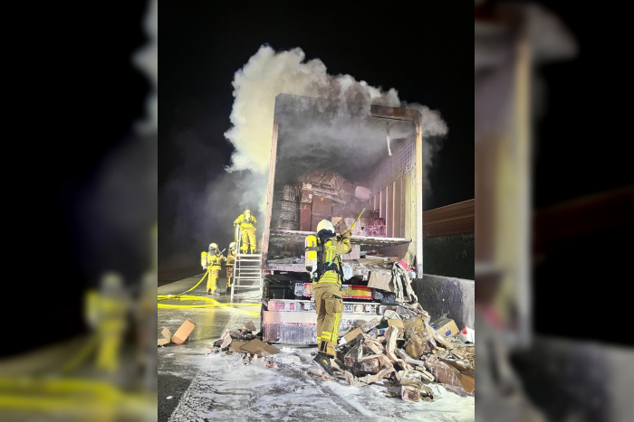 Feuerwehr mehrere Stunden im Einsatz, Anhänger mit Paketen brennt, keine Verletzten