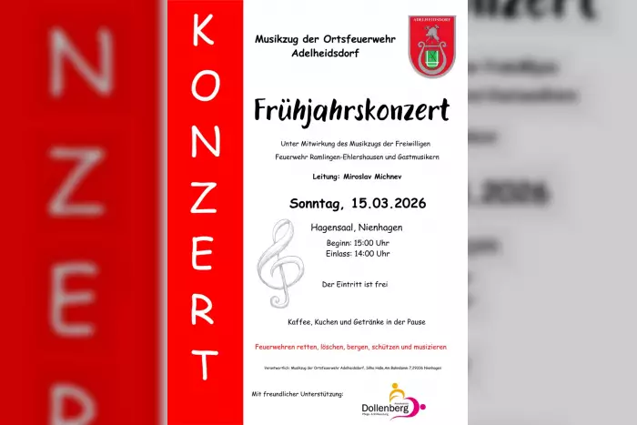 Die Musikkapelle der örtlichen Feuerwehr Adelheidsdorf, unterstützt vom Musikkapelle der Freiwilligen Feuerwehr Ramlingen-Ehlershausen und von Gastmusikern, lädt zu einem Konzert am Sonntag, dem 15. März 2026 um 15.00 Uhr in den Hagensaal ein. Unter der Leitung von Miroslav Michnev werden Stücke aus Musicals, Filmmusik, Schlager von den Comedian Harmonists und Udo Jürgens, Popsongs von Billy Joel, Tony Christie und Abba, Praise the Lord von Michael van Delft, Melodien aus Lord of the Dance und als Höhepunkt Highland Cathedral mit dem Dudelsack-Solisten Alexander Kreit präsentiert. Der Einlass beginnt um 14.00 Uhr und der Eintritt ist frei. Während der Pause werden Kuchen, Kaffee und andere Getränke angeboten.