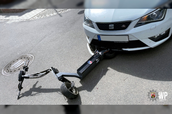 Ein E-Scooter-Fahrer kollidierte mit einem Auto und verletzte sich. Der Roller wurde beschlagnahmt zur Überprüfung der Geschwindigkeit.