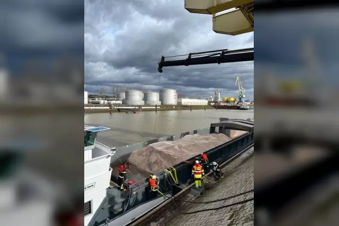 Ein Gütermotorschiff im Hafen Andernach leckgeschlagen. Feuerwehr und DLRG im Einsatz zur Beseitigung der Leckage.