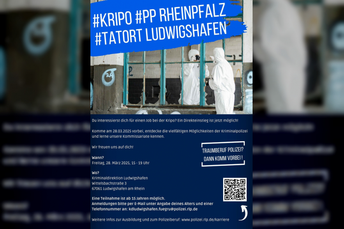 Bist du interessiert? Dann besuche am 28.03.2025 von 15 bis 19 Uhr die Kriminaldirektion Ludwigshafen in der Wittelsbachstraße 3 in Ludwigshafen und informiere dich über deinen Traumberuf. Entdecke die Chancen in der Kriminalpolizei und lerne verschiedene Kommissariate und ihre Aufgaben kennen. Eine Teilnahme ist ab 15 Jahren möglich. Melde dich jetzt unter Angabe deines Alters und deiner telefonischen Erreichbarkeit an bei: kdludwigshafen.fuegru@polizei.rlp.de