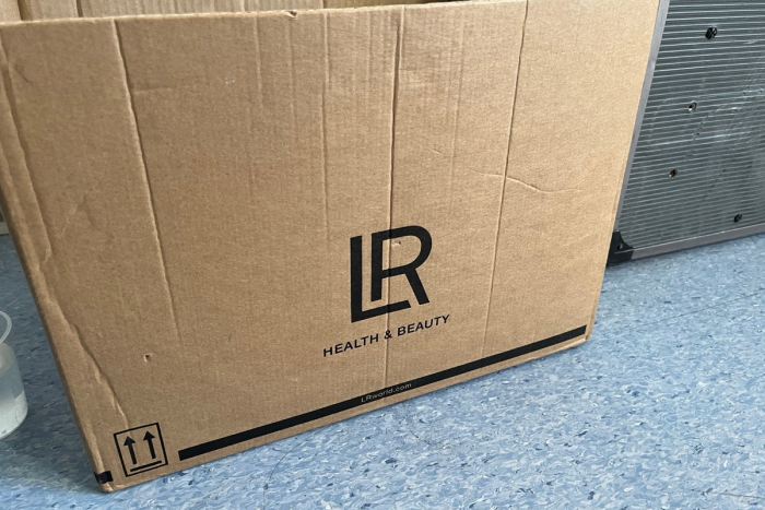 Die kleinen Kätzchen und ihre sehr zutrauliche Mutter (weiß mit braunen Flecken) befanden sich in einem Karton mit der Beschriftung „LR – Health & Beauty“.