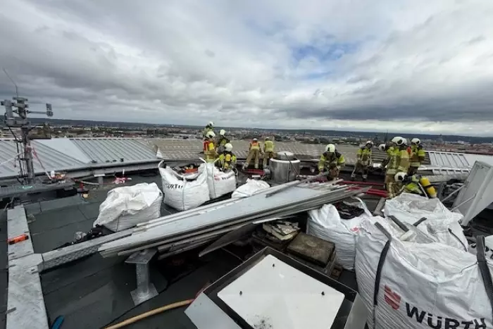 Die Einsatzkräfte hatten bis dahin etwa 50m² Dachhaut geöffnet. Dafür wurden Bleche von etwa 1m x 3,5m Größe teilweise abgeschraubt, teilweise abgeflext. Die Bleche wurden geordnet auf dem Dach zwischengelagert und nach Abschluss der Arbeiten durch die Dachdeckerfirma mit Spanngurten gesichert. Das unter der Dachhaut befindliche Dämmmaterial wurde auf etwa 10m² Fläche schrittweise geöffnet, kontrolliert und gelöscht. Aufgrund des starken Windes konnte nicht ausgeschlossen werden, dass gelöstes Material vom Dach fällt. Daher wurde der parallel stattfindende Wochenmarkt vorsorglich abgebrochen und der Bereich rund um das Gebäude von der Polizei weiträumig abgesperrt. Nach Abschluss der Löschmaßnahmen führte die Feuerwehr Messungen in allen Etagen durch. Diese blieben – mit Ausnahme der Etagen 15 und 16 – ohne Befund. Die betroffenen Etagen bleiben vorsorglich weiterhin gesperrt. Gegen 16 Uhr führten Kräfte der Wache Altstadt eine Nachkontrolle der Brandstelle durch, die mit einer Wärmebildkamera überprüft wurde. In zwei Bereichen hatten sich Glutnester gebildet, die mit einer Kübelspritze gekühlt wurden. Weitere Maßnahmen durch die Feuerwehr waren nicht erforderlich. Die Gebäudeverwaltung übernahm anschließend die regelmäßige Kontrolle des Bereichs.