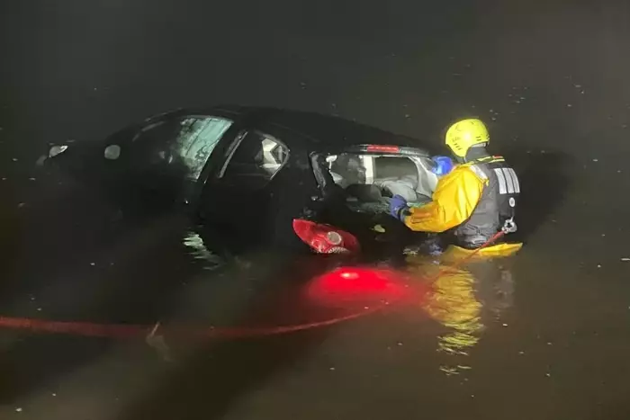 Feuerwehr und Rettungsdienst retten Fahrer aus der Elbe und bergen das Fahrzeug sicher an Land. Einsatzkräfte sichern die Einsatzstelle und übergeben sie an die Wasserschutzpolizei.
