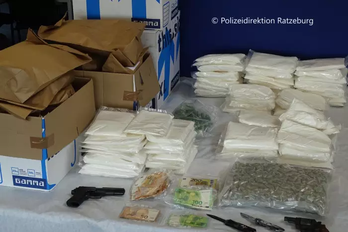 Zusätzlich ergaben die Ermittlungen, dass der 26-jährige Verdächtige aus Bad Oldesloe angeblich zusammen mit anderen Verdächtigen größere Mengen Marihuana in Paketen aus Spanien erhalten haben soll. Am Donnerstagabend wurden sieben Personen vorläufig festgenommen. Die folgenden Durchsuchungen in sechs Wohnungen in Bad Schwartau, Lübeck und Bad Oldesloe ergaben eine Gesamtmenge von 63 Kilogramm Amphetamin, 15 Kilogramm Marihuana und etwa 10.000 XTC-Pillen. Die beschlagnahmten Drogen haben einen geschätzten Straßenverkaufswert von 883.000EUR. Zudem wurden verschiedene Rohstoffe zur Herstellung von Amphetamin, zwei Schreckschusspistolen, mehrere Messer und ungefähr 9.000 Euro Bargeld beschlagnahmt.