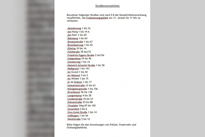 Am Sonntag, den 11. Januar 2026, wird eine 250 Kilogramm schwere Fliegerbombe entschärft. Anwohner aus 6000 Haushalten müssen bis 11:00 Uhr evakuiert sein.