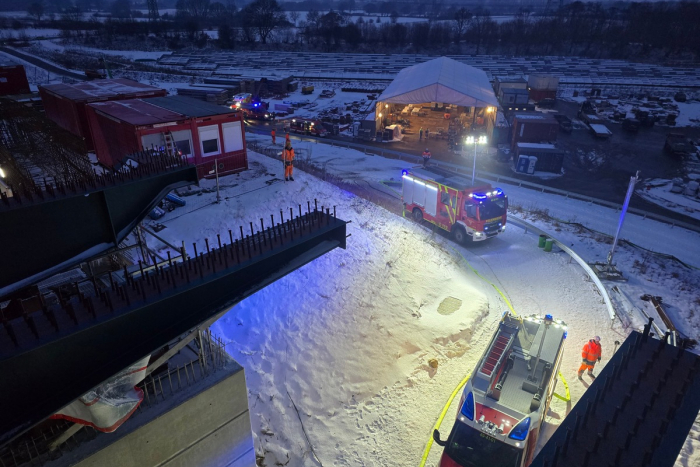 Am Dienstagmittag um 13:23 Uhr wurden die Feuerwehren Borgstedt, Bünsdorf und Büdelsdorf zu einem brennenden Acetylenbehälter auf dem Ersatzbauwerk der Rader Hochbrücke gerufen.