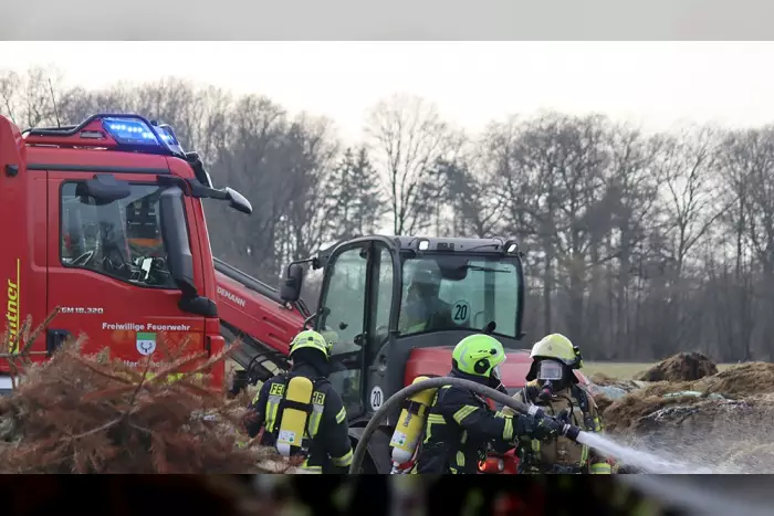 Um ein Übergreifen auf den angrenzenden Stall zu verhindern, wurde eine Riegelstellung schnell errichtet. Insgesamt brannten ca. 50-60 Rundballen. Außerdem waren einige Reifen, die zur Abdeckung eines Silos gelagert waren, in Brand geraten.