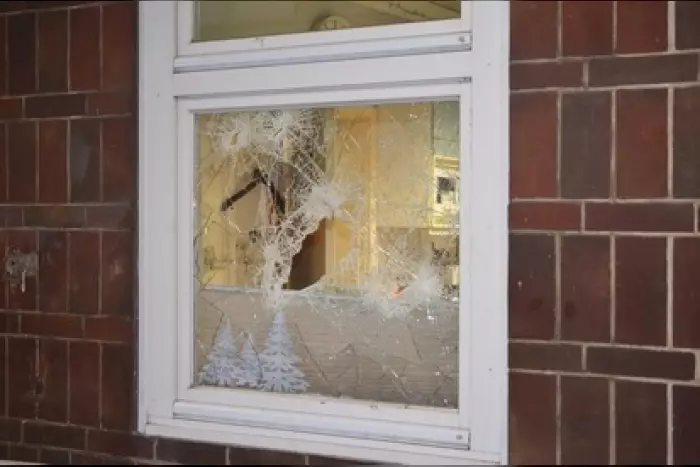 Die Bundespolizisten stellten auf Bahnsteig 1 am Servicegebäude eine zersplitterte Scheibe fest (siehe Bild). Eine Bahnmitarbeiterin öffnete den Beamten die Tür und diese betraten den Raum. Dort entdeckten sie einen Mann, der dort schlief. Die Bundespolizisten weckten den Mann und befragten ihn zum Einbruch.