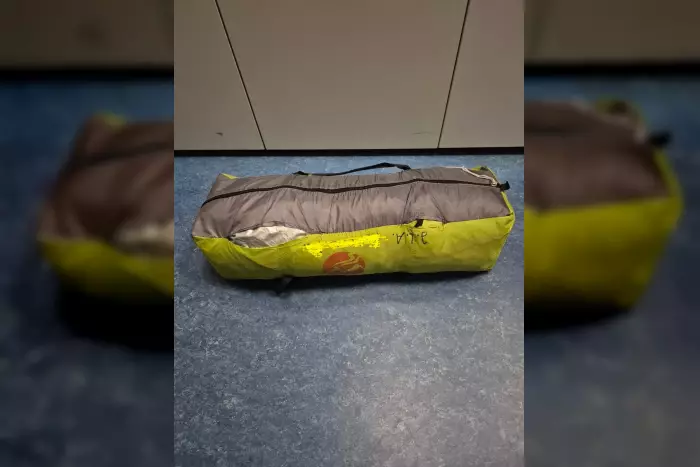 Ein Schlafzelt konnte bisher nicht zugeordnet werden. Es ist in einer gelb-grauen Tasche verpackt und trägt an der Seite die Aufschrift „J.L.A.“ und einen Namen, möglicherweise Hinweise auf den Besitzer.