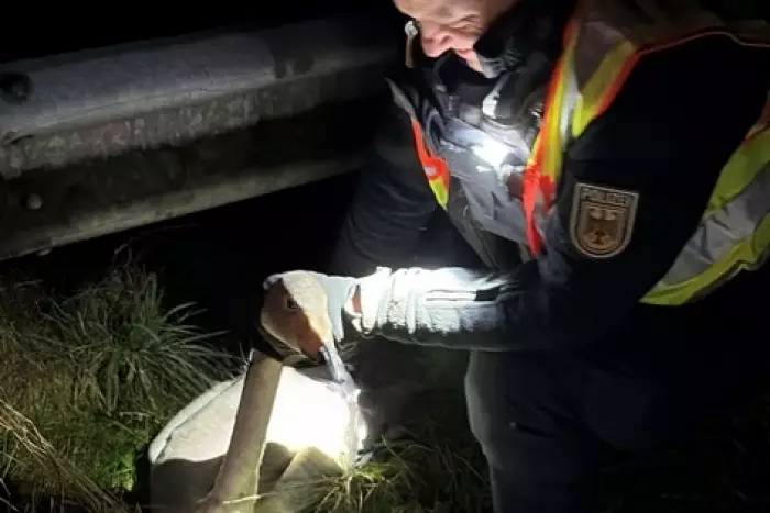 Gestern Abend kam eine Streifenwagenbesatzung der Bundespolizei auf eine unklare Verkehrslage im Bereich Handewitt zu. Auf der B199 im Bereich der Kurve zur Auffahrt zur A7 stand ein PKW mit eingeschalteten Warnblinklicht und ein Bus fuhr dort in Schrittgeschwindigkeit. Die Beamten entdeckten einen offensichtlich verletzten Schwan mit Blutanhaftungen in der mittleren Schutzplanke.