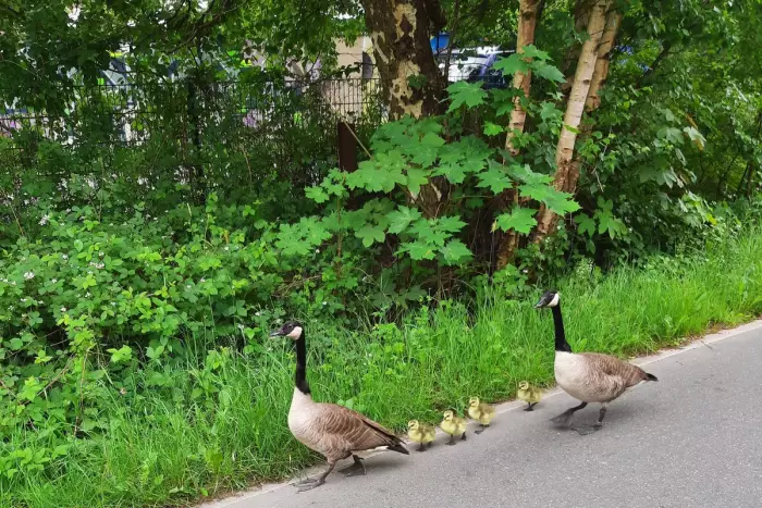 Um 15:30 Uhr ging bei der Regionalleitstelle ein Anruf von Passanten ein, die eine Gruppe von Kanadagänsen auf der Veloroute 10 in der Nähe des Hasseldieksdammer Weges meldeten. Die Gänsefamilie blockierte die Fahrradstraße und brachte so manche Fahrradbremse zum Quietschen. Vor Ort trafen die Beamten auf ein Gänsepaar, das seine Küken zu einem Ausflug animiert hatte. Diese watschelten gemächlich die Straße entlang.