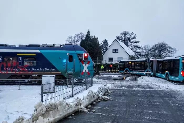 Heute Morgen steckte ein Schulbus aufgrund der Witterungsbedingungen auf einem Bahnübergang in Ottendorf nahe Pönitz im Kreis Ostholstein fest. Die Schüler alarmierten den herannahenden Regionalexpress mit ihren Handys. Der Lokführer konnte rechtzeitig eine Notbremsung durchführen und knapp vor dem Schulbus zum Stehen kommen.