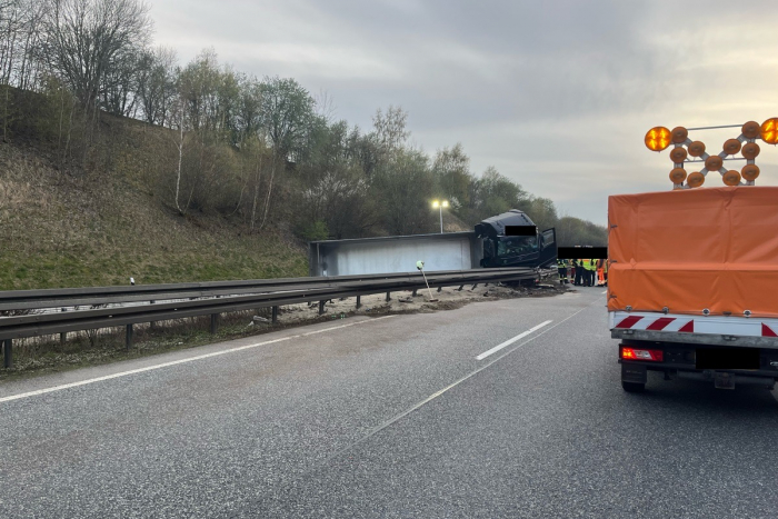 Am Mittwoch, dem 15.04.2026, ereignete sich gegen 18:40 Uhr ein Unfall auf der Bundesautobahn 38 in Richtung Leipzig, zwischen den Ausfahrten Leinefelde-Worbis und Breitenworbis. Ein Sattelzug, beladen mit Sand, kollidierte mit der Mittelleitplanke und kippte um. Ein geplatzter Reifen auf der Fahrerseite verursachte den Unfall.
