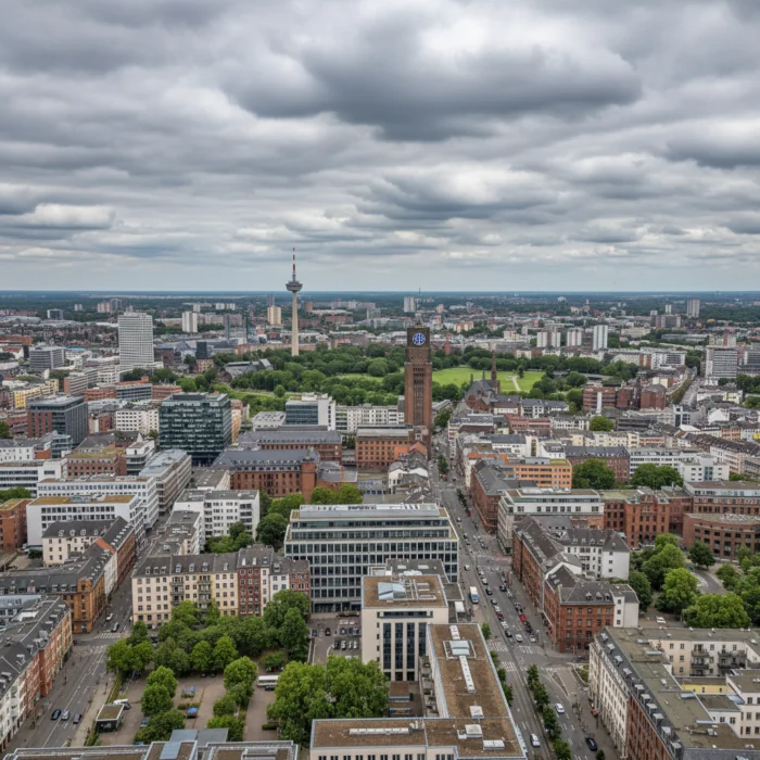 Am Sonntag wird in Dortmund wechselhaftes Wetter mit leicht bewölktem Himmel und hoher Regenwahrscheinlichkeit erwartet. Die Temperaturen liegen tagsüber zwischen 7.6°C und 13.6°C, während ein frischer Wind aus Südwest weht.