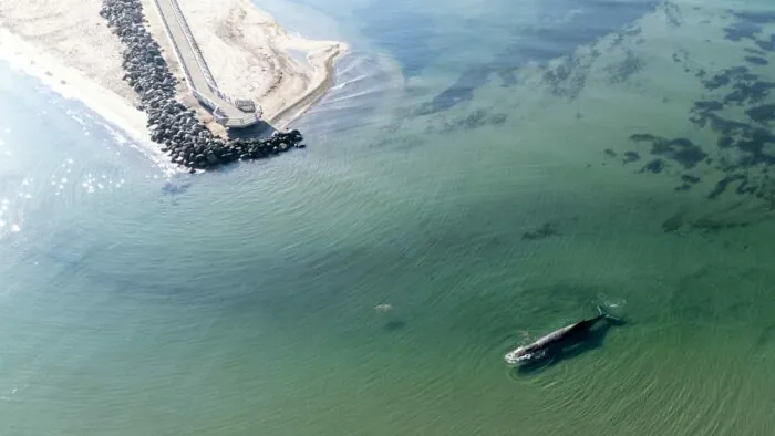 Nach ersten Informationen lebt der Wal noch, jedoch ist seine gesundheitliche Verfassung äußerst besorgniserregend. Der Meeressäuger ist nur teilweise mit Wasser bedeckt und kann sich nicht aus seiner misslichen Lage befreien.