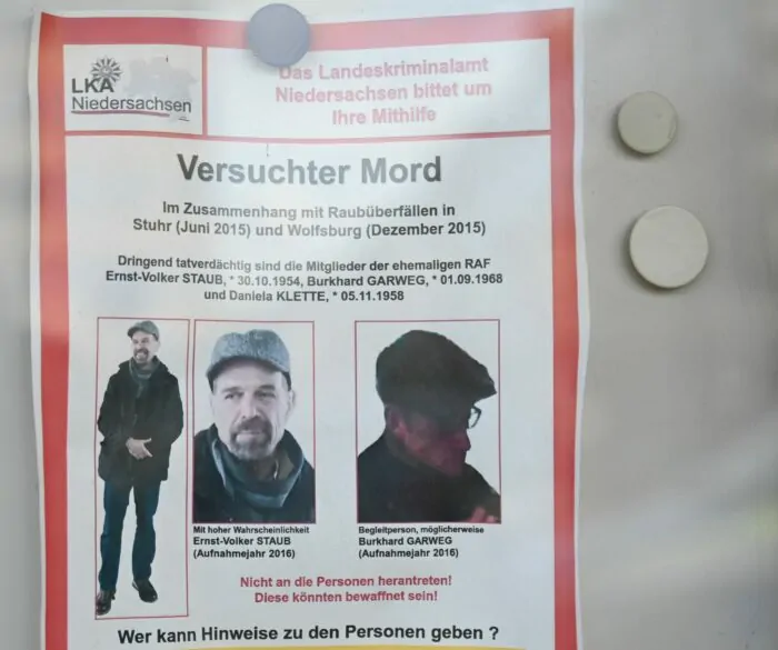 In der Sendung «Aktenzeichen XY… ungelöst» hat die Staatsanwaltschaft Verden Hinweise zu früheren Terroristen der Roten Armee Fraktion (RAF) erbeten. Der Sprecher der Staatsanwaltschaft, Koray Freudenberg, appellierte auch an Unterstützer der Beschuldigten, mit der Staatsanwaltschaft in Kontakt zu treten. «Wir können von Glück sprechen, dass bisher niemand getötet wurde», sagte Freudenberg.