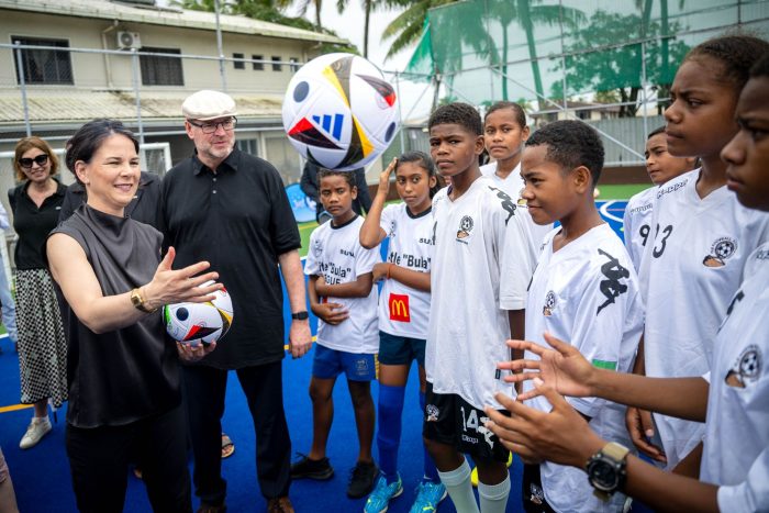 Die Delegation von Außenministerin Annalena Baerbock musste während ihres Besuchs in Fidschi eine sportliche Niederlage einstecken. Beim Elfmeterschießen gegen eine gemischte U-15-Nationalmannschaft aus Juniorinnen und Junioren des kleinen Inselstaats verlor das Team Deutschland mit 1:5.