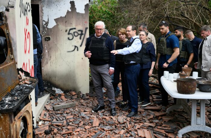 Beide Präsidenten besuchten den Kibbuz unter höchsten Sicherheitsvorkehrungen, sie trugen schusssichere Westen. Steinmeier, der von seiner Frau Elke Büdenbender begleitet wurde, zeigte sich nach der Besichtigung der zerstörten Siedlung erschüttert. Natürlich habe man in Deutschland nach dem 7. Oktober viele Bilder gesehen und viele Nachrichten gehört. «Wir haben eine Vorstellung davon gehabt, mit welcher Brutalität die Hamas hier vorgegangen ist. Aber, hier an diesem Ort zu sein, ist etwas vollständig anderes.»